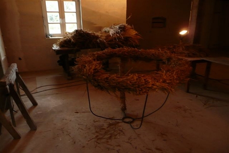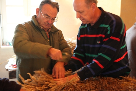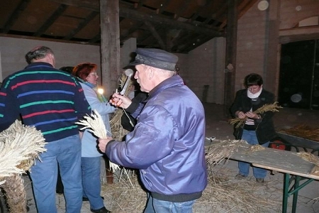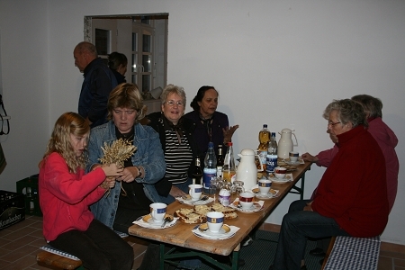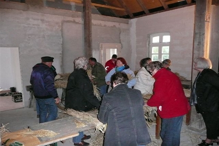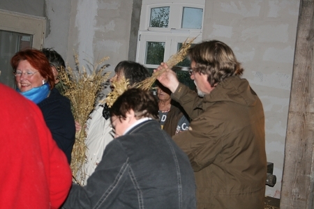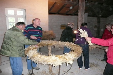 Fröhlich ging es zu beim heutigen Erntekronebinden des Heimat- und Kulturvereins Hage und Umgebung e. V. Der Vorstand hatte eingeladen, und viele Mitglieder und Gäste fanden den Weg zum Heimatmuseum am Bootshafen. Gut gelaunt ging man die Sache an, und selbst Herr Pastor Weth von der St. Ansgarikirche wurde in die Geheimnisse des Erntekronenbindens von den Vorstandsmitgliedern Christel Schmidt, Helga Christians, Anita Heyen, Joachim Pommerening und Waltraud Windmann eingebunden. Das Kronebinden fand dieses Jahr zum ersten Mal im Heimatmuseum statt. Die Jahre zuvor hatte man auf Einladung der Familie Smidt am Berumerfehnkanal die Krone gebunden. "Leider lassen persönliche Umstände es nicht mehr zu, dass Familie Smidt uns eine Beherbergung bieten kann" so die Aussage von J. Pommerening. Er bedankte sich in einer kurzen Ansprache bei allen Helfern Groß und Klein und weist darauf hin, das die Erntekrone am kommenden Sonntag in der St. Ansgarikirche, im Gottesdienst um 10:00 Uhr, geweiht wird. Pastor Weth erläuterte, dass auch dieses Jahr wieder für den Sudan gesammelt wird, und zwar für einen weiteren Anbau eines schon gespendeten Kindergartens in Khartoum/Sudan. Fotos: Bodo Kiefer, Danke!