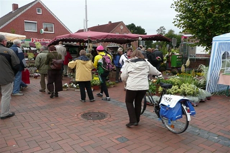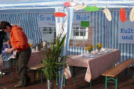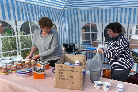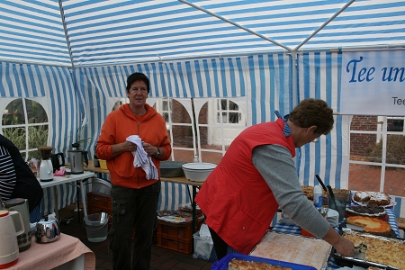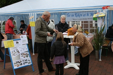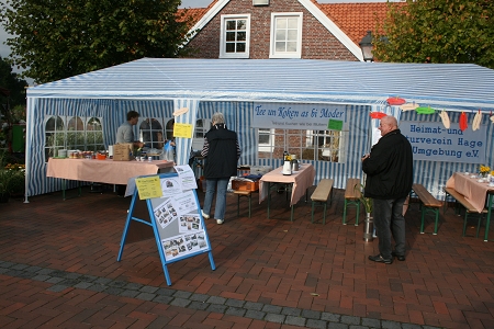 Am 19. September fand der alljährliche Hager Tuffelmarkt statt. Bis mittags meinte es der Wettergott recht gut mit uns - es blieb trocken. Nachmittags setzte er leichter Nieselregen ein. Trotzdem genossen viele Gäste den Tuffelmarkt, vor allem der Stand des Heimat- und Kulturvereins Hage und Umgebung e. V. war mit seinem traditionellen Verkaufsstand ein Anziehungspunkt. Selbstgebackene Torten, Kuchen, Kaffee und Tee standen zur Auswahl, eine Kartoffelschätzung rundete das große Angebot ab. So ließen sich die Gäste im Zelt des Heimatvereins alles gut schmecken...